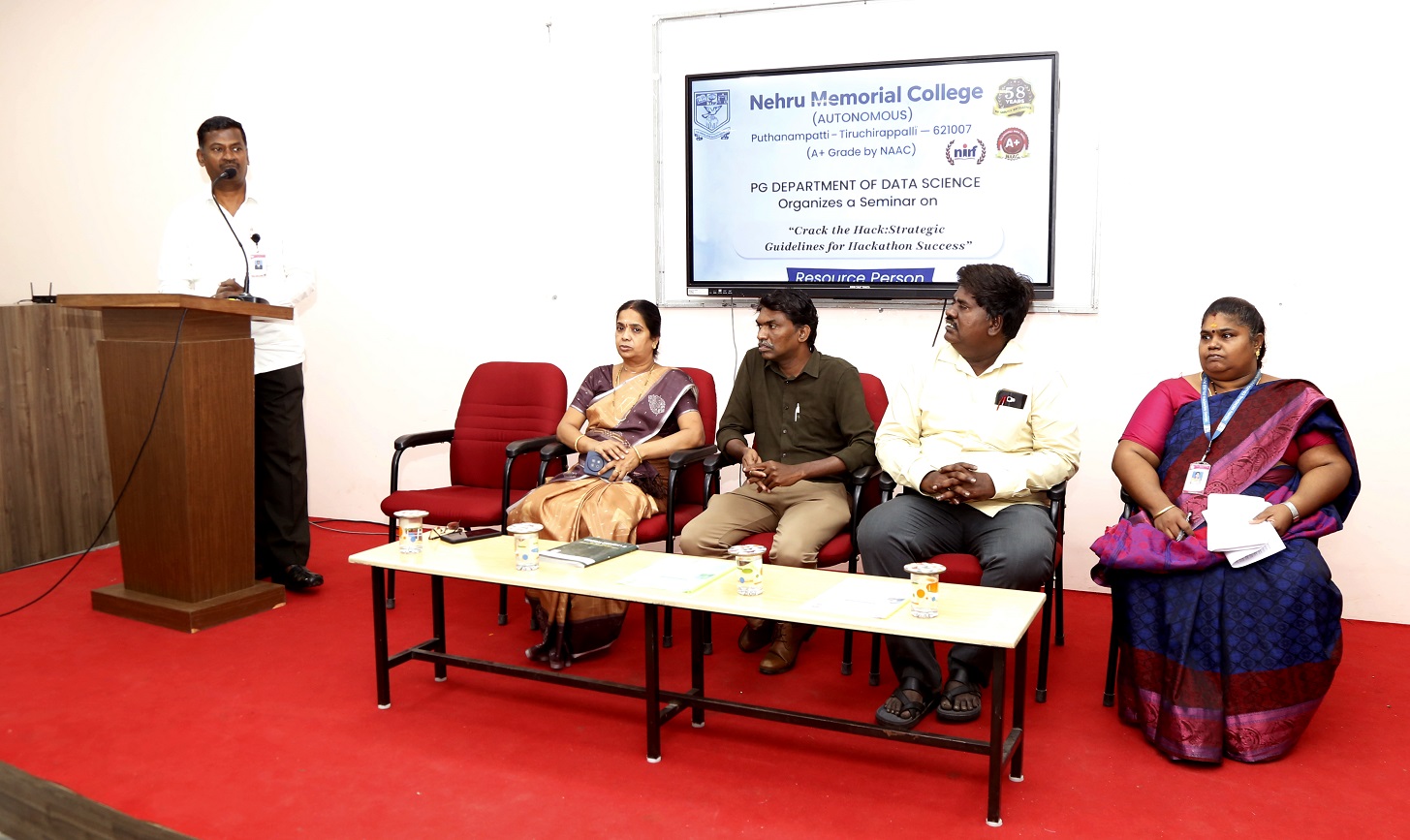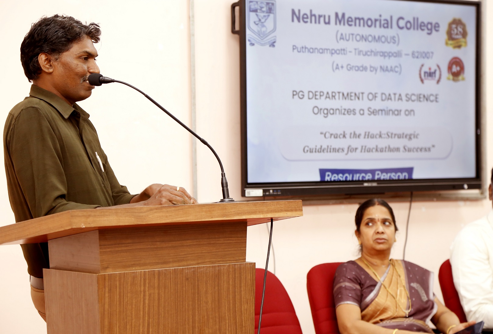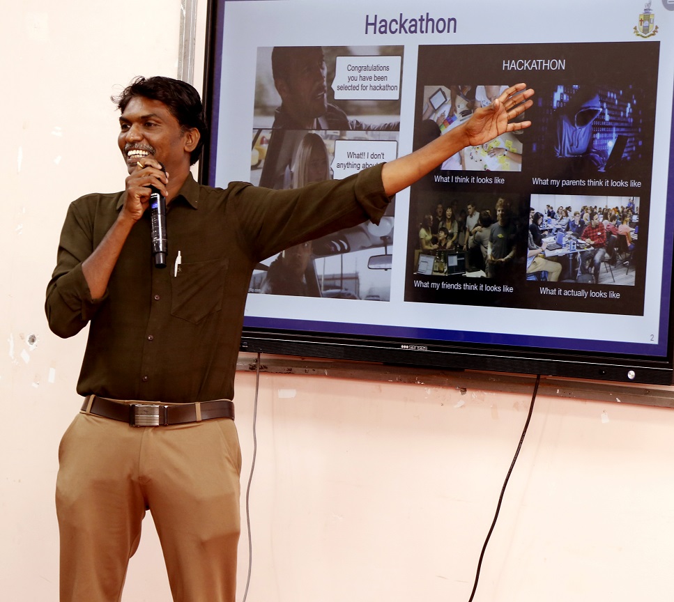 The seminar on “Crack the Hack: Strategic Guidelines for Hackathon Success” was delivered by Dr. P. S. Eliahim Jeevaraj, Assistant Professor, Department of Computer Science, Bishop Heber College. In his presentation, he provided deep insights into the real dynamics of hackathons, highlighting the “brutal truth” that a majority of teams fail due to lack of strategy, clarity, and execution. He emphasized that winning a hackathon is not about coding skills alone, but about problem clarity, innovation, feasibility, UI/UX, business value, and effective presentation. He explained the importance of mindset engineering, pre- hackathon preparation, team structure, and technology selection. Students were guided on how to choose the right problem, validate it quickly, avoid over-ambitious ideas, and focus on building a working demo within limited time. He also shared practical strategies such as using pre-trained AI models instead of training from scratch, preparing reusable assets, and practicing the final pitch multiple times before presentation.