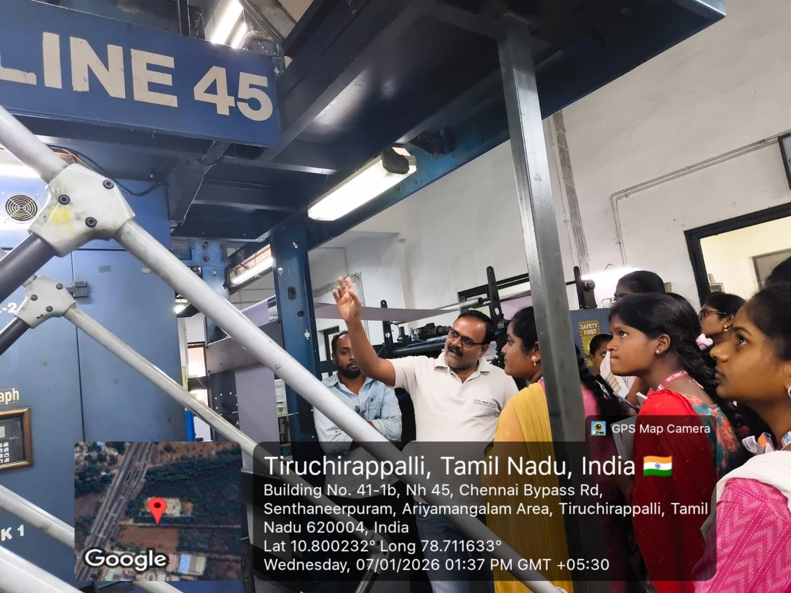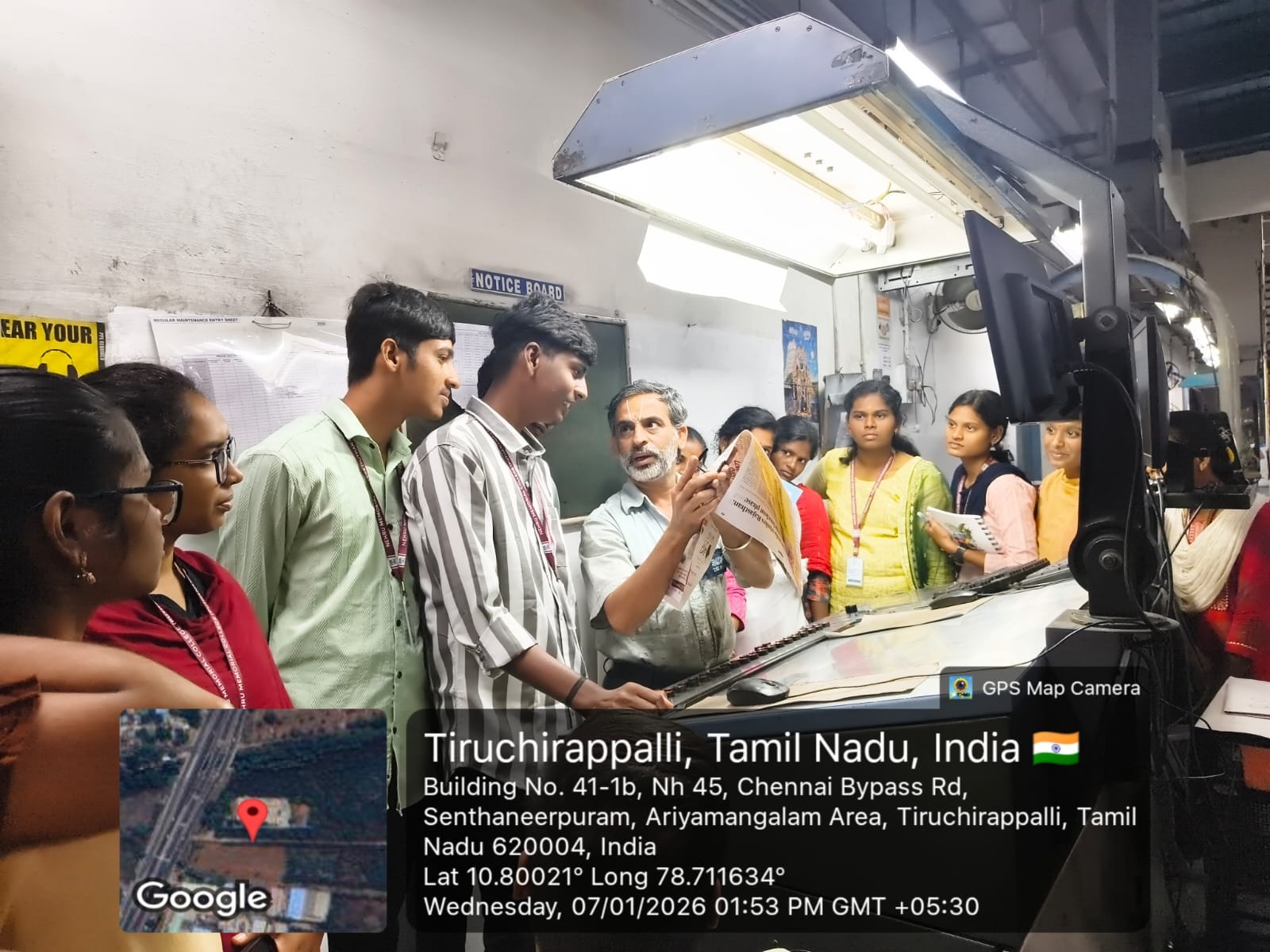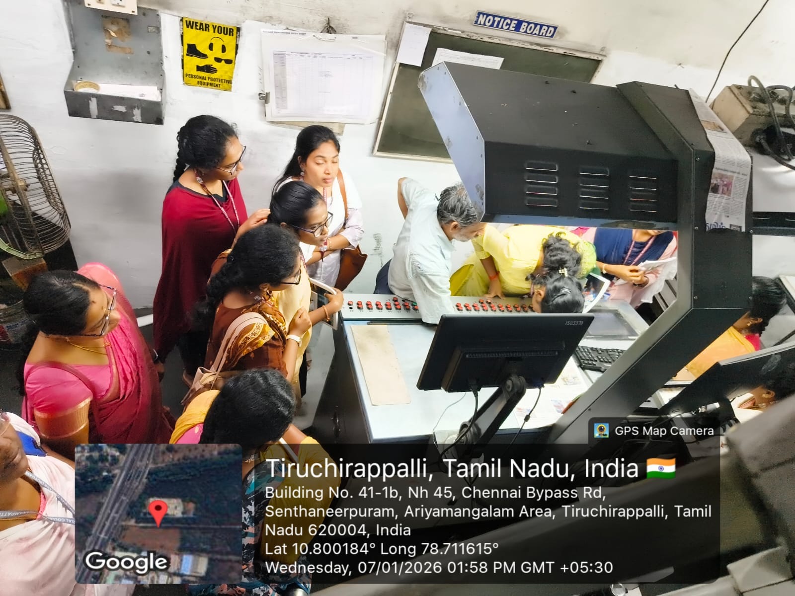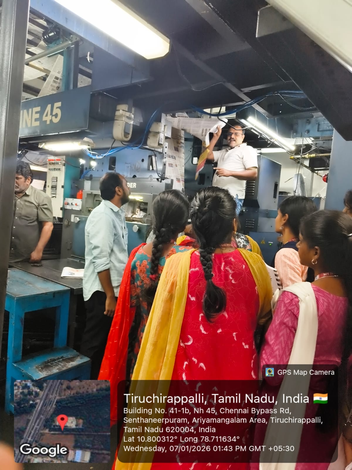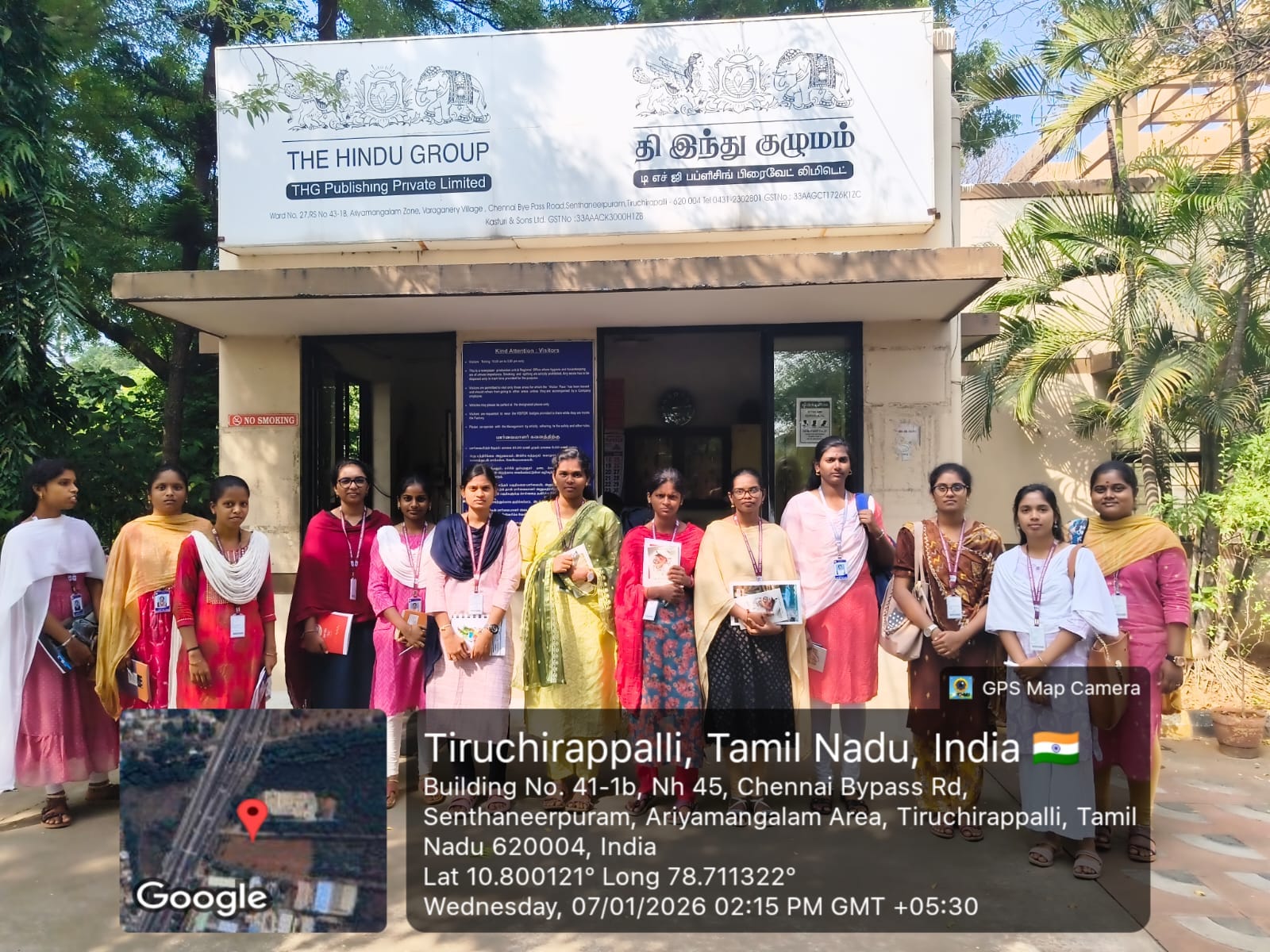 The Department of English at Nehru Memorial College (Autonomous), Puthanampatti, organized an educational field visit to The Hindu Daily office in Trichy on January 7, 2026. The purpose of this visit was to give students practical exposure to the newspaper industry, print media, and the field of journalism. A total of fifteen I BA English students and two II MA English students visited the daily office.