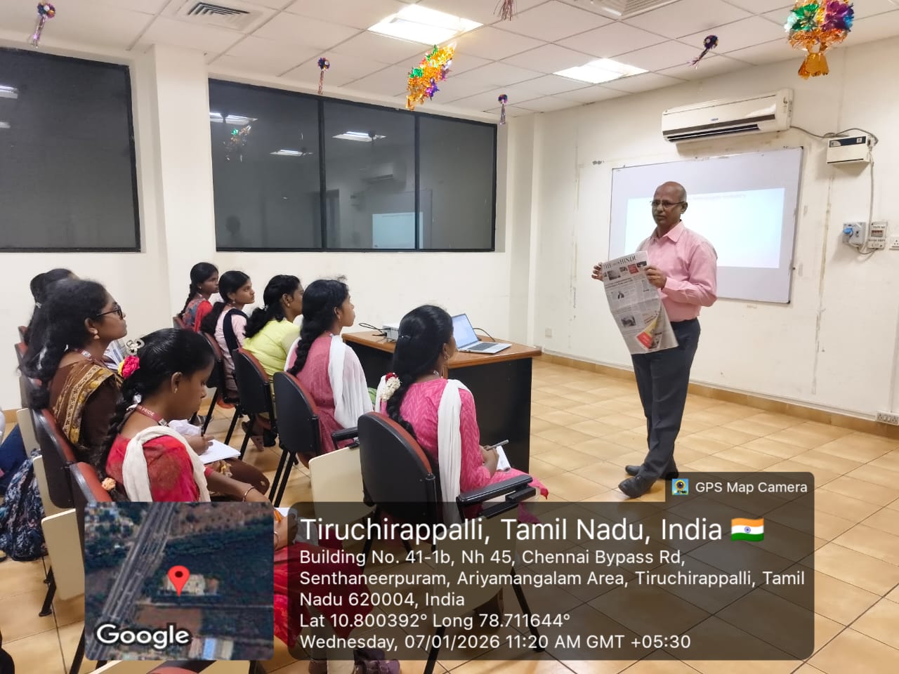 Mr Laxman, Senior Advertisement Officer, offered a cordial welcome to the students and the faculty. Mr. K. Venkatesan, AGM (Advertisement), gave an insightful talk on the structure and operations of the newspaper industry. He emphasized on the importance of advertisements as a major source of revenue for newspapers and explained how advertising content is planned, designed, and published. Mr. Venkatesan also provided a detailed explanation of the journalism process. He talked about how news is collected, verified, written, edited, and finally published. He introduced the students to various journalistic positions, such as Editor, Sub-editor, Reporter, and Correspondent. The session also covered different types of journalism, including print journalism, digital journalism, and investigative journalism. Mr. Venkatesan offered valuable advice on how to become a journalist, stressing the importance of education, writing skills, ethics, and professional commitment. He also elaborated on the job opportunities available in the newspaper and media industries.
